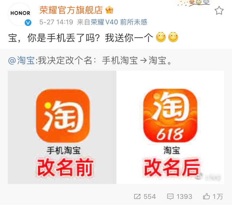 淘宝APP改名后,不少人调侃“怎么把手机丢了”,“荣耀”官微还跑出来说可以送一个手机。