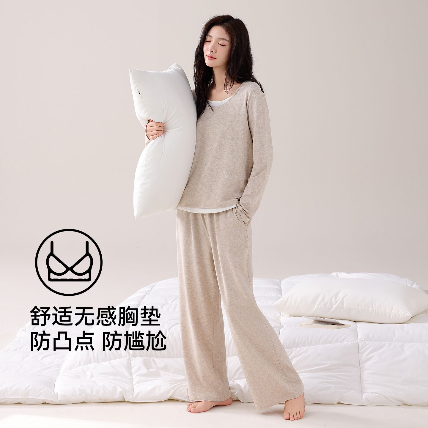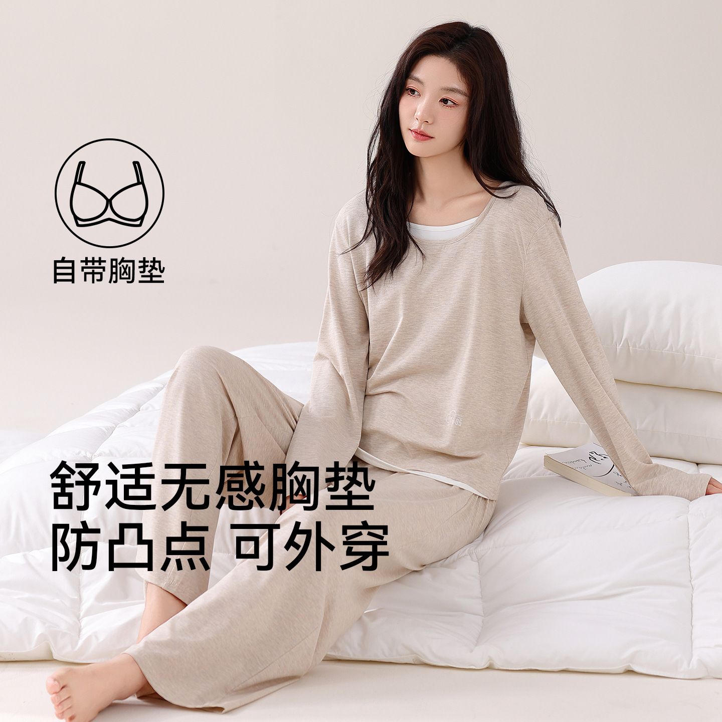 长袖带胸垫睡衣女春秋季莫代尔休闲假两件套头家居服套装【8天内发货】