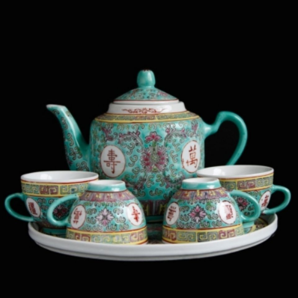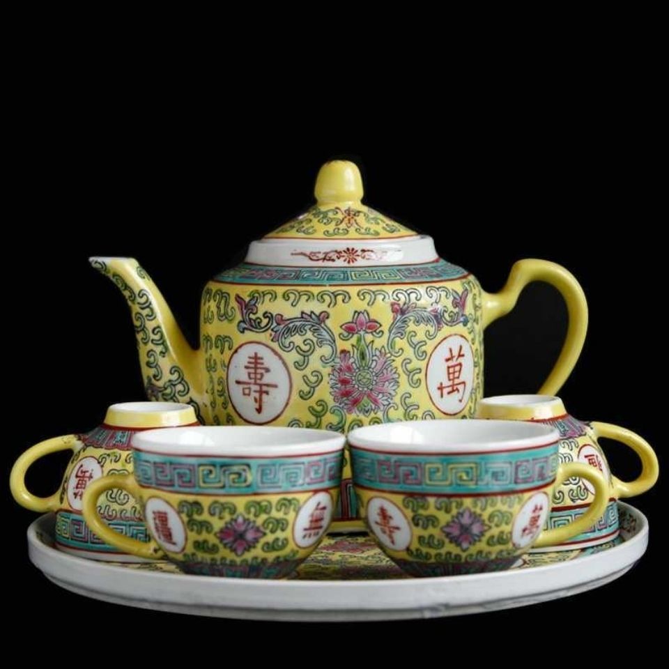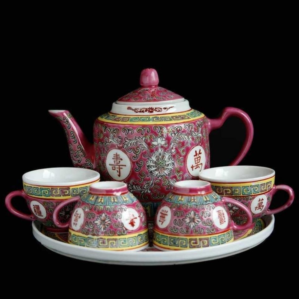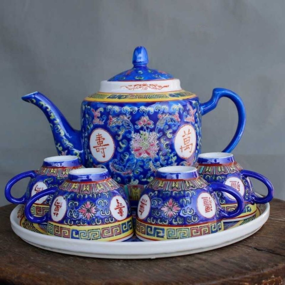 景德镇老厂货传统陶瓷手绘万寿无疆六头茶具茶壶茶杯套装收藏怀旧
